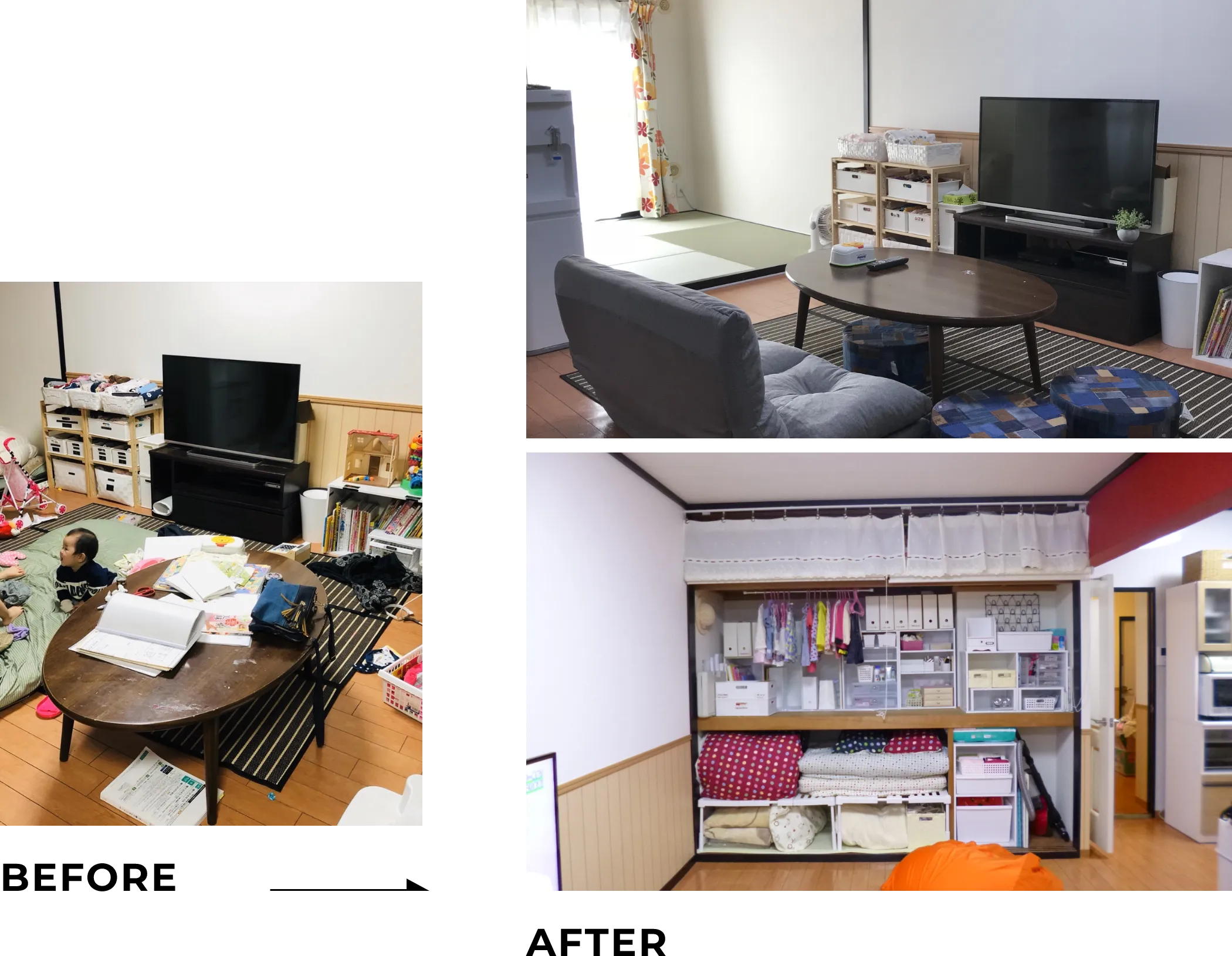 押し入れ・仏間スペースが上手く使えていなかった為、一旦全体のモノの見直し仕分けから始め必要なモノの量が把握できたところで、押し入れ・仏間スペースを管理しやすい収納の仕組みに作り替え、仕分け済みのモノを収納して完了。